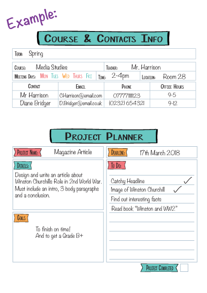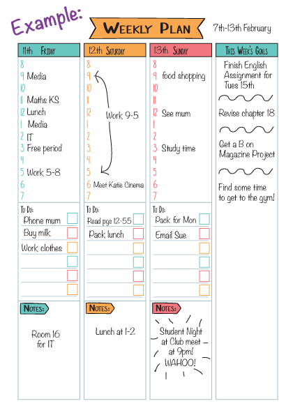 The Student Planner lasts for one year and it is undated so it can be started at any time of the year that you wish. The Student Weekly Plan is the main section of the academic diary, it is a 1 week to view over two pages containing a daily timetable, daily to do lists, daily notes section and a weekly goals area.